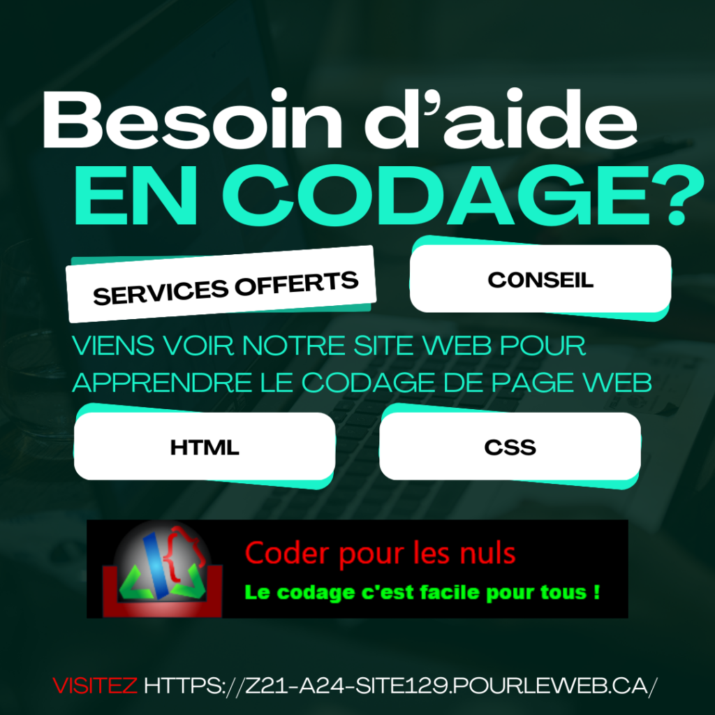 Bienvenue sur mon site pour apprendre à coder! Ici est la page d’accueil. D’ici vous avez accès, à l’aide du menu, à tous les cours disponibles pour bien débuter en HTML/CSS.